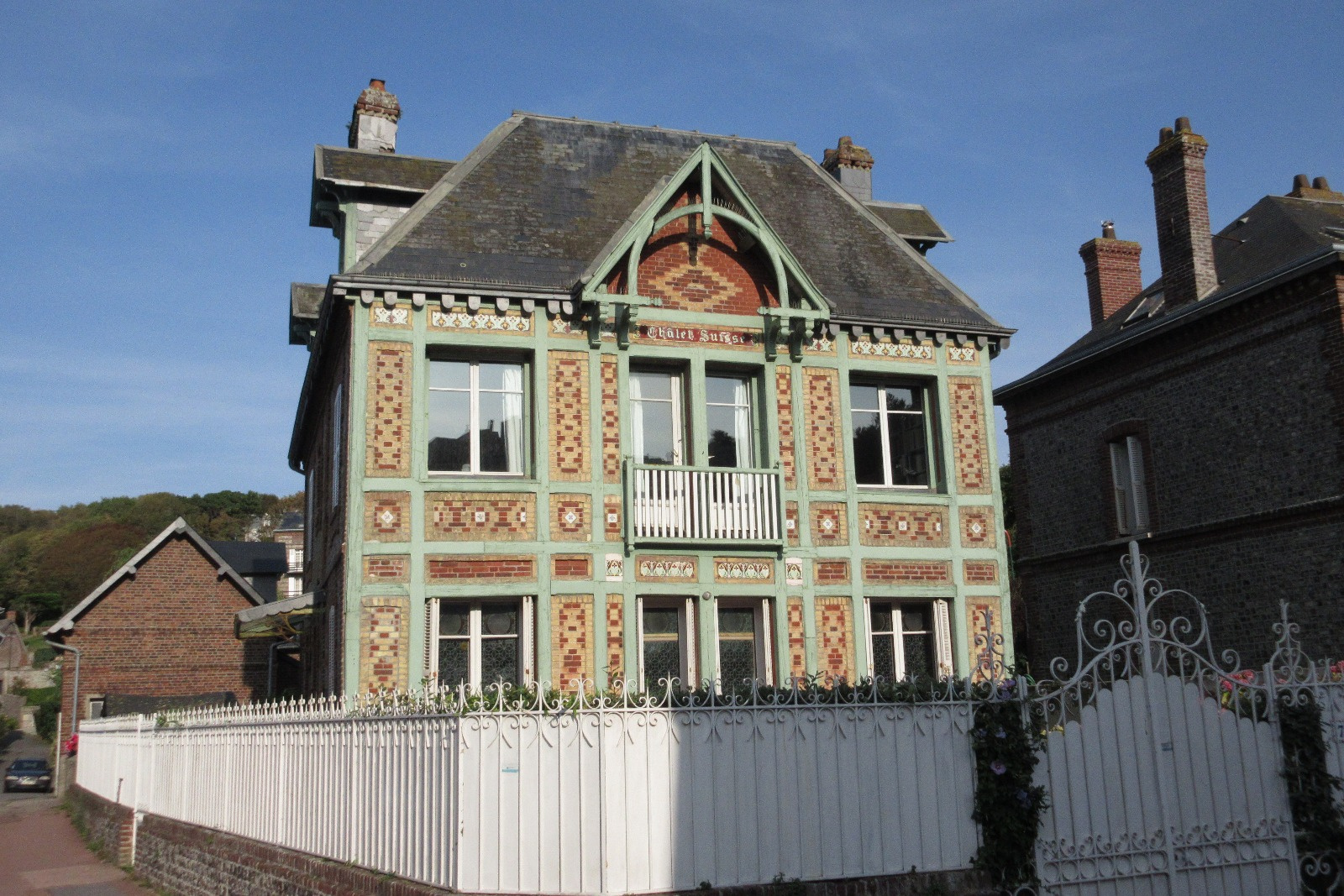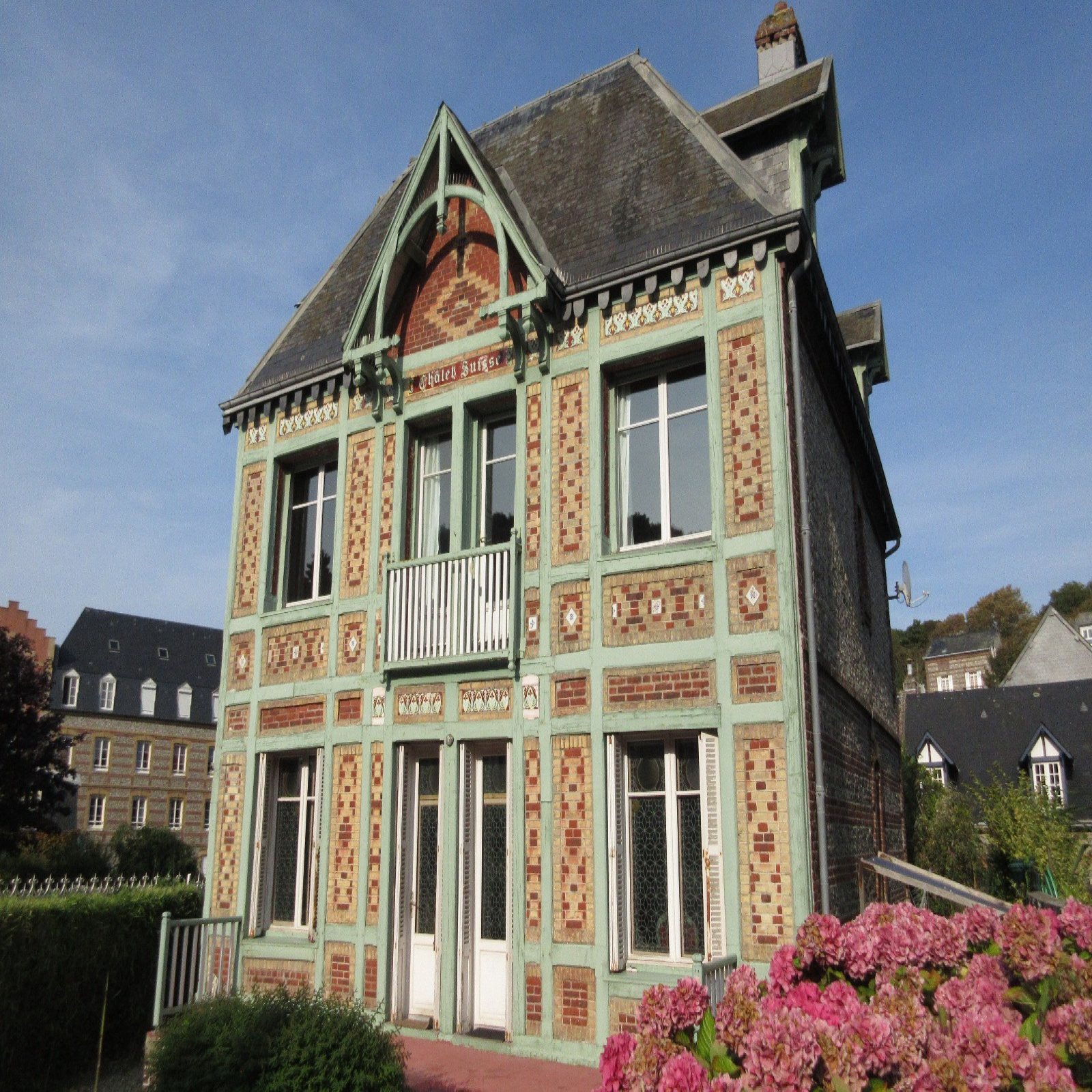 LE CHALET SUISSE, venez visiter l'une des plus belles maisons de Veules, située tout près de la plage, construite en grès, briques, silex et colombages. D'une surface de 197 m², elle se compose comme suit : rez de chaussée : cuisine, salle - à manger salon en parquet pour 38m², une chambre et toilettes.1er étage : double salon ( en parquet) de 37m² exposé Ouest, une chambre, salle de bains,toilettes.2ème étage : 4 chambres dont 2 très petites, salle d'eau.Cave.Jardin.